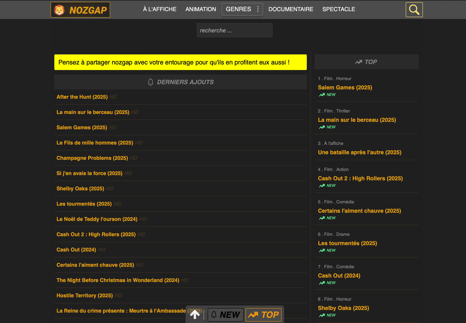 Nozgap fait partie des nouveaux sites de streaming gratuits en pleine ascension. Simple, accessible, sans inscription, avec un catalogue large… mais aussi les limites habituelles des plateformes non officielles.