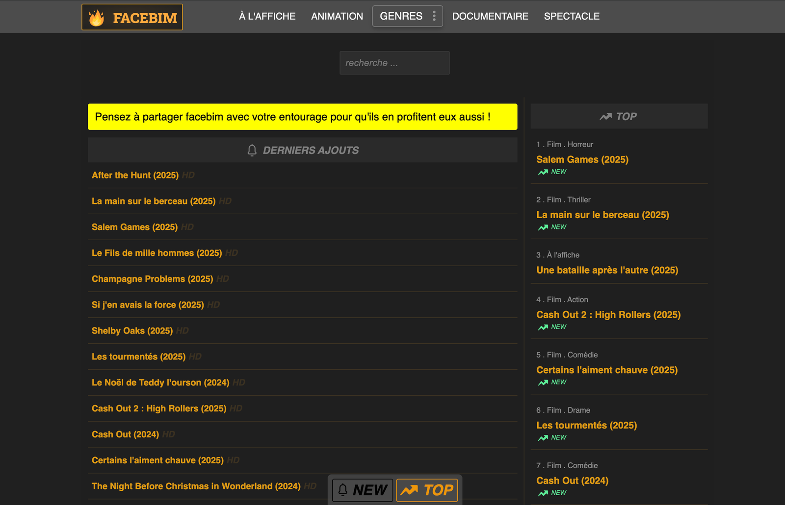 Pour rester en ligne, le site migre régulièrement. En décembre 2025, seule l’adresse facebim.com est officielle.